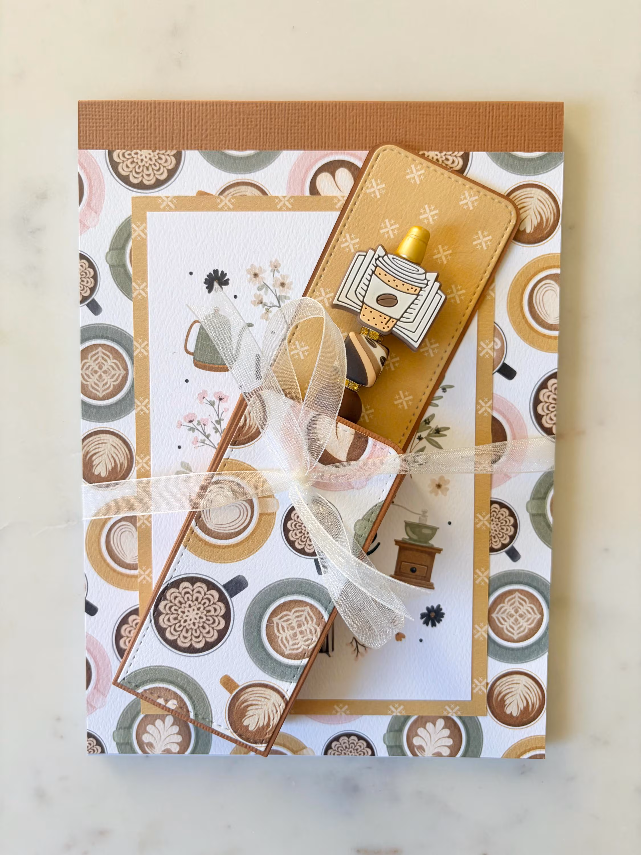 This adorable coffee themed stationery gift set is perfect for caffeine lovers! It includes a handmade notebook, matching pen gift box/holder with a handmade beaded coffee pen, all coordinated in a cute design.